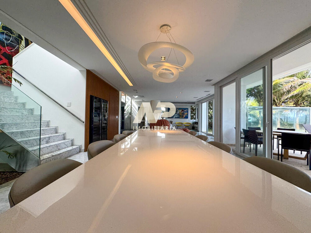No pavimento térreo, a casa oferece acesso pedestre e 10 vagas de garagem, sendo 5 cobertas e 5 destinadas a visitantes. As salas de estar e jantar são amplas e integradas, ideais para receber com elegância, além de lavabo, cozinha moderna e funcional e uma charmosa varanda gourmet. A área externa é um verdadeiro convite ao lazer, com piscina privativa com deck molhado, rodeada por jardins e com vista para o mar.