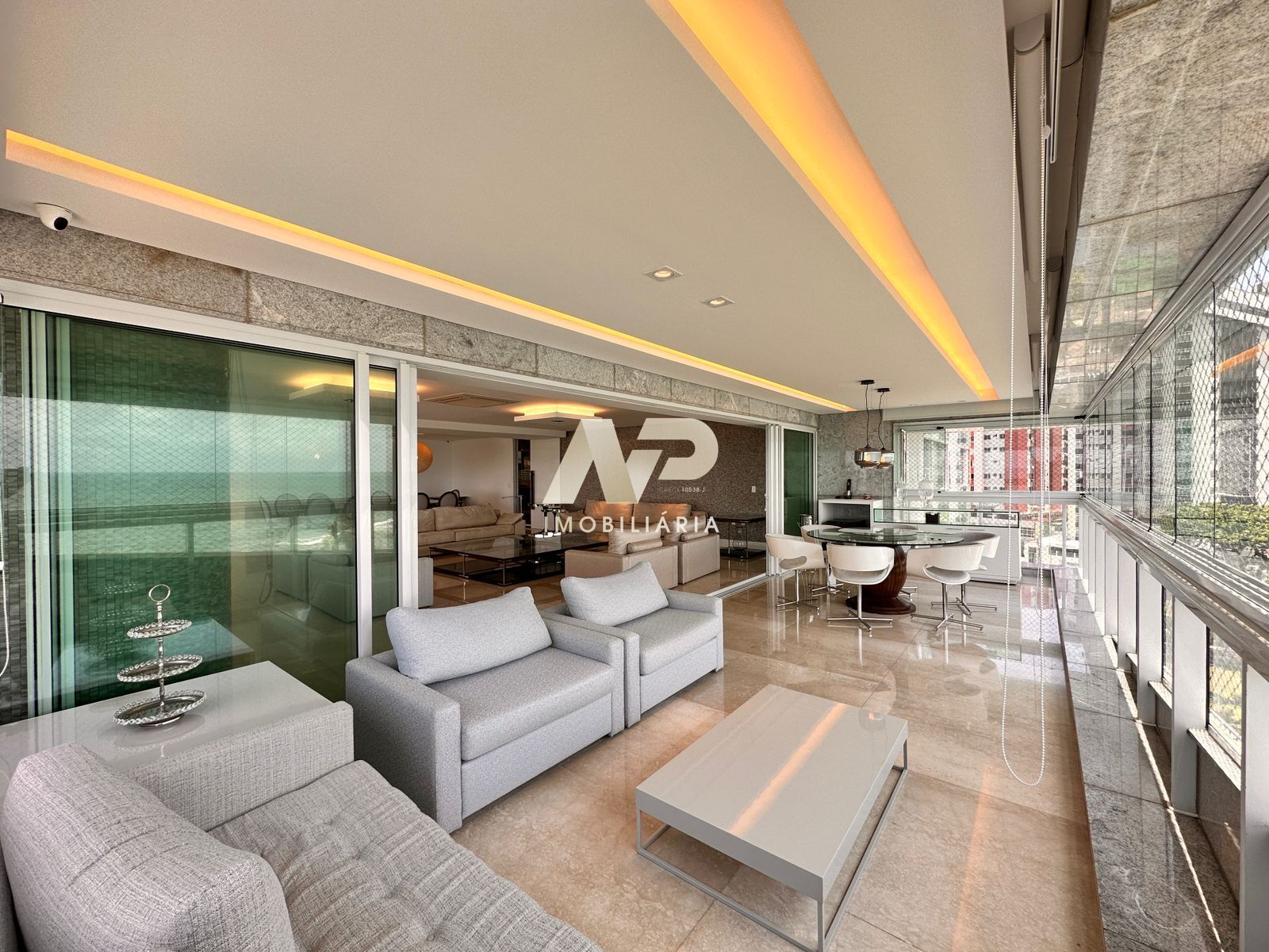 Com um design moderno e funcional, o apartamento dispõe de uma ampla sala de estar e jantar, com uma vista privilegiada para o mar. Os móveis são cuidadosamente selecionados e combinam com a decoração contemporânea do ambiente, proporcionando um clima aconchegante e sofisticado.