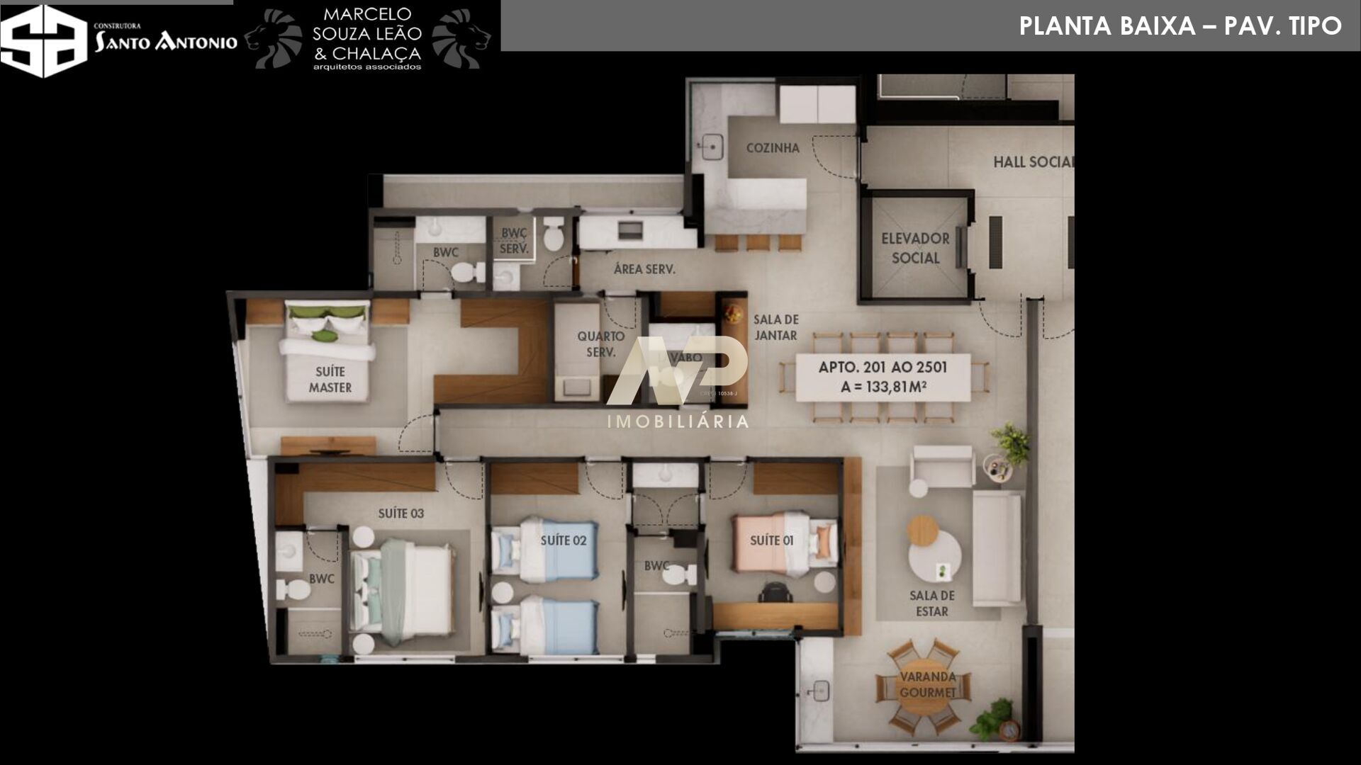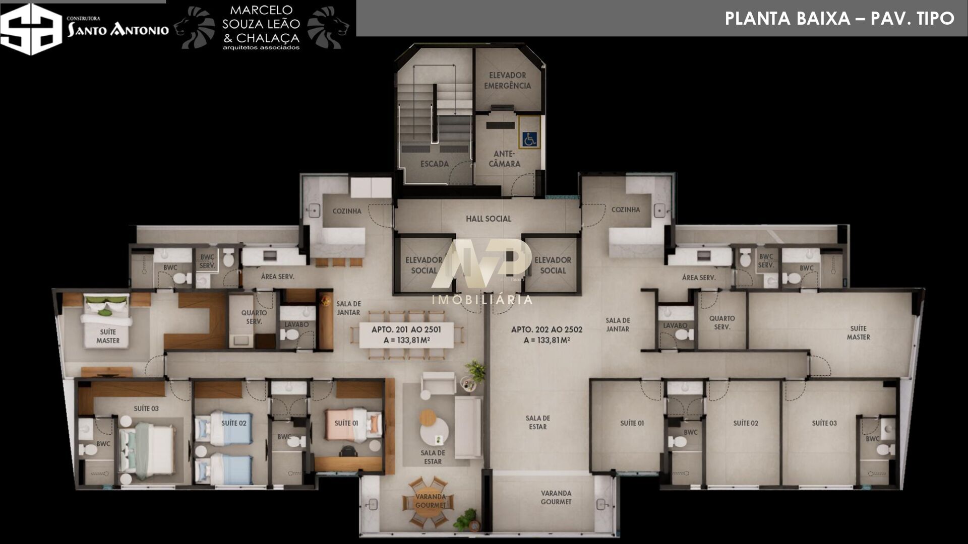 Os apartamentos possuem 133,80 m² muito bem distribuídos, com quatro quartos, sendo três suítes, ampla sala para dois ambientes, varanda gourmet, cozinha funcional, área de serviço, dependência completa, duas vagas de garagem, preparação para split e aquecedor de água. O acabamento em porcelanato valoriza ainda mais os ambientes.