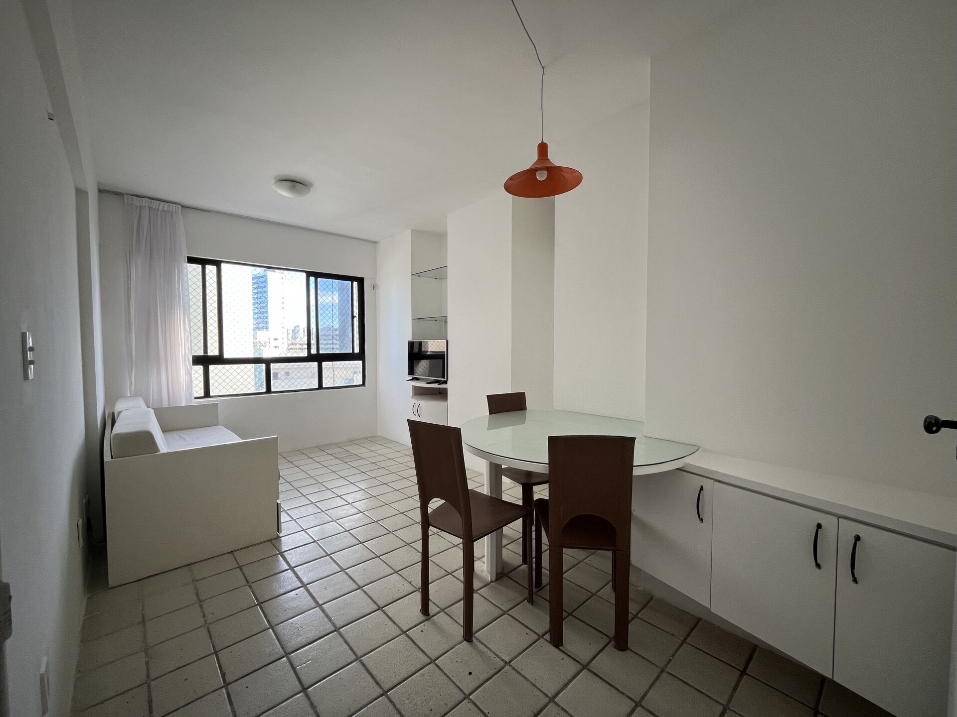 O flat conta com 1 dormitório, sala para dois ambientes, cozinha com área de serviço, banheiro social, armários planejados, ar-condicionado e 1 vaga de garagem rotativa, oferecendo praticidade e conforto em cada detalhe. Ambientes bem distribuídos e funcionais, perfeitos para o dia a dia ou para locação.