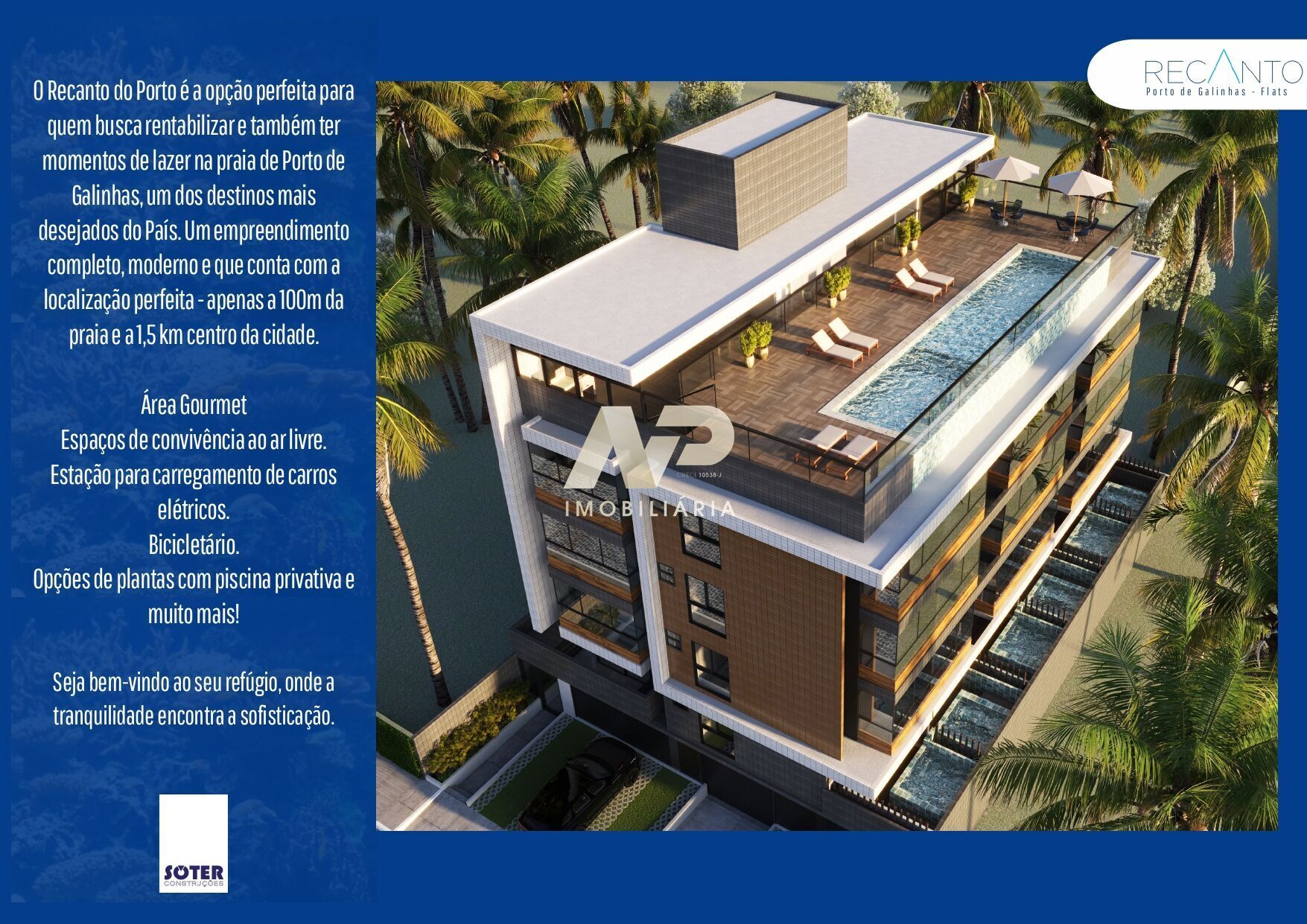 Aqui, cada detalhe convida você a desacelerar, aproveitar o clima tropical e viver momentos inesquecíveis, cercado por belezas naturais e pela energia única de Porto de Galinhas. O Recanto do Porto é mais que um imóvel: é um convite para viver o melhor do litoral com conforto, charme e rentabilidade.